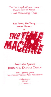 My wife and I arrived at the Orpheum theater shortly before 7:00 and the line was already at the corner of the block. At 7:00 the theater starting letting us in. The L.A. Conservancy had a table set up in the lobby enticing people to joinand also had a table set up for Arnold Liebovit who was offering for sale signed copies of his video The Fantasy Worlds of George Pal . We picked up a copy of the flyer pictured below and received a program at the door into the main theater. While settling in, the theater was playing tracks from The Time Machine soundtrack and various vintage radio advertisement for the film as well. On the far right side of the stage stood a very imposing Gort. At a few minutes to eight Gort began opening and closing his visor and powering up his 'death ray'. At 8:00 the stage presentation began. Maxwell DeMille was introduced by a member of the L.A. Conservancy and he began by apologizing for Jeri Ryan being late, a Miss Watchett approached him with a note which read "If I'm not here by 8:00, start without me." At which time the curtains opened and Miss Ryan 'arrived' via Fred Barton's replica Time Machine. The stage was turned over to Miss Ryan and she in turn introduced Forest J. Ackerman, Arnold Leibovit and Alan Young. Miss Ryan conducted a question and answer session with the guests. After the Q&A the stage was returned to Mr. DeMille who then introduced Clyde Lucas (producer & director of Time Machine: The Journey Back) and Brian Jameison (VP of Warner Home Video), they announced that The Time Machine was scheduled to be released on DVD on Oct. 3, 2000, included would also be Time Machine: The Journey Back. Also announced was that there would be a special limited edition boxed set of the DVD, contents still being discussed. An intermission was called before starting the film. During the intermission Ed Sussman performed various science fiction movie and TV themes on a theremin. Among the pieces played were themes from Outer Limits, Star Trek, and The Day the Earth Stood Still (Gort's personal favorite). After the intermission, the film was started with much applause from the audience. The print was extremely good and a pleasure to watch. I highly recommend seeing the film on a theater screen if you ever have the chance to do so. This was the second time I was able to see the film in a theater within a three week period. Not long ago I discovered that the film was playing for a short time in a theater in Beverly Hills. The theater was filled with about 40 people and were obviously people who wanted to enjoy the film as not a sound was heard from them during the entire film. Somehow from that day to the 40th anniversary screening the film apparently became a comedy. The audience was laughing at nearly everything on the screen. If George Pal was there in spirit I'm sure he was confused by the reaction if not appalled by it. The next morning I played my Laser disk copy of the film so I could watch it without the 'laugh track'. Don Coleman |