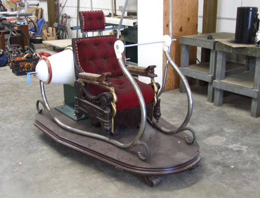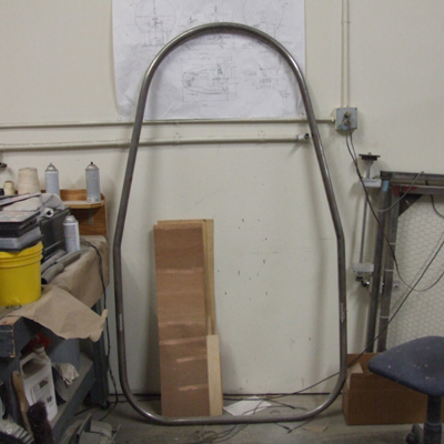 The left arm attached to the chair to check the fit. The arm is a casting taken from a mold made on my chair. The rails had been fabricated at this time also. Thanks much to Chris and Ivan at Azusa Pipe and tube bending for doing sucha great job in making them. It was difficult to see the welds on these parts. |