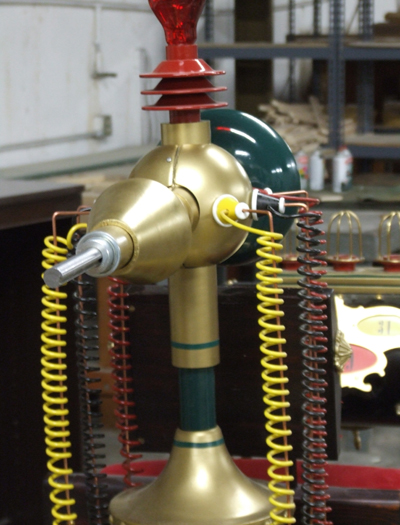 Upper cage installed, also made form 9/64" brass rod. The light bulb is a replica of an early Edison bulb. This particular one has a quad loop filiment. Decals applied tot he rear green disk and the counter balance weight. |