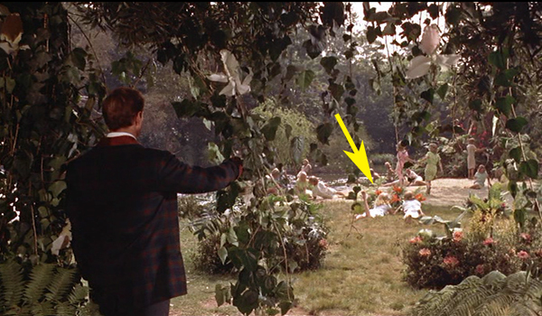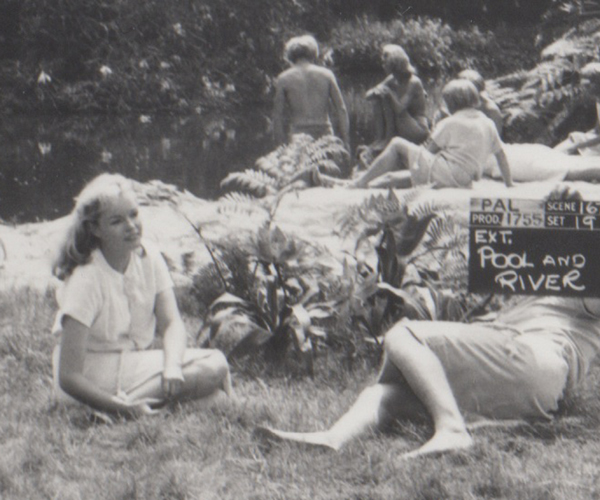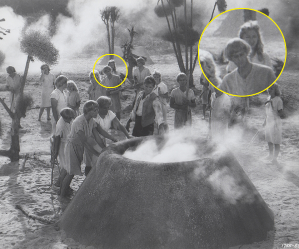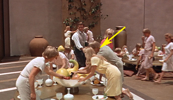 These are two frames show the Eloi outside of the sphinx after several of the Eloi have gone inside. Theorectically they should have the same paople in the same locations as one is supposed to be a close up of the other. However, you can see that the paople in one frame may not even be in the second. Josephine is in the long shot but not the closeup. She also ends up insdie the sphinx as do others shown here as being outside. Josephine observed that George Pal set each shot and used who he thought looked best for the scene. Josephine and a couple of the other girls had real blonde hair, not wigs and were used more often thean those wearing the wigs. | |