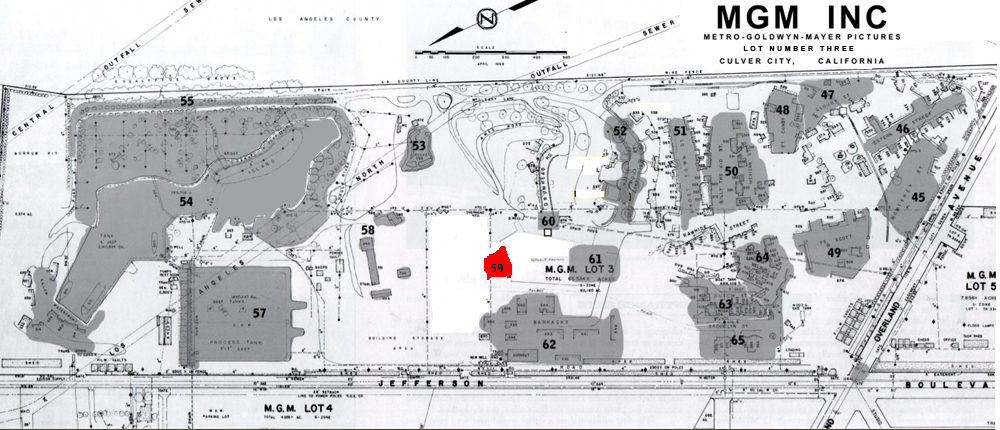 | Below are maps of MGM's lot 1, 2 and 3. All of the film was filmed in the locations marked in red. We are still missing a couple locations. Each day of shooting will show the photo(s) we have for that date and a map showing where that days shooting took place. Some days may only have one photo while others will have multiple. As you will see by the calendar on the next page we don't have photos for every day of filming. |