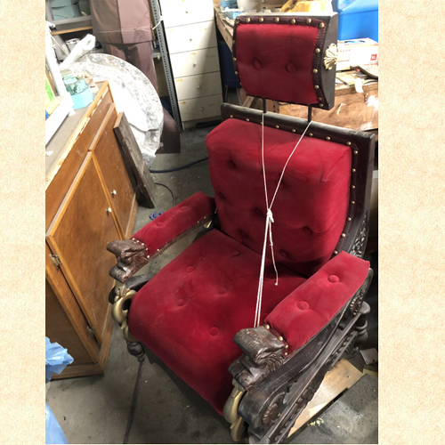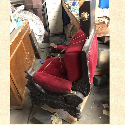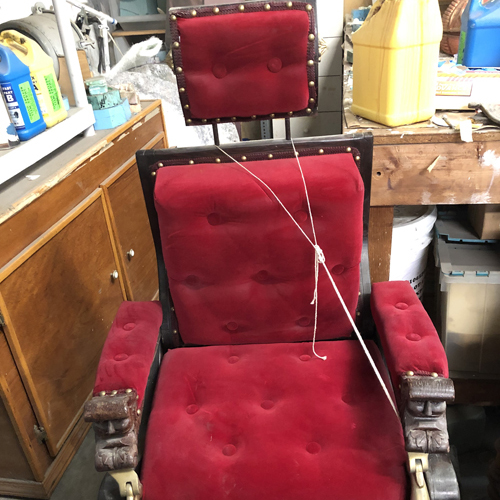 the chair was awaiting repurposing, two of the side carvings were lost