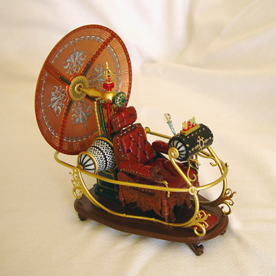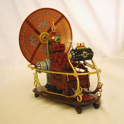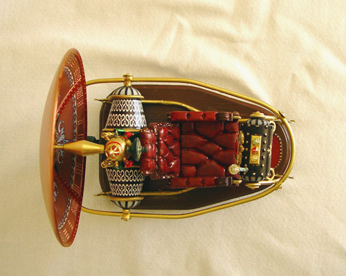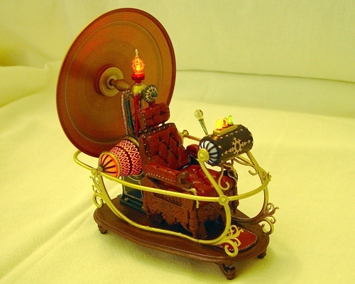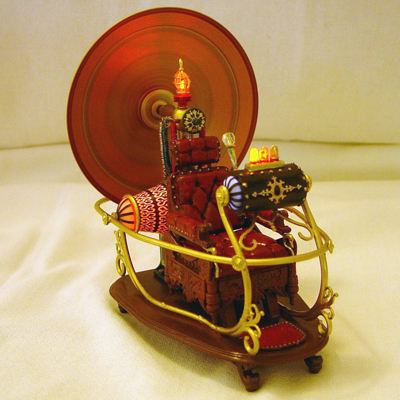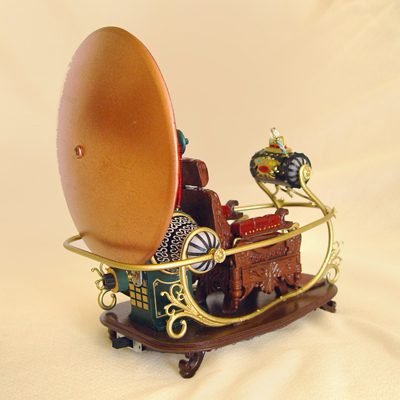 The rear lamp, rear pods, and yellow console lamps all light up and the red and green console lamps blink. Also the sides and date display of the console light up I substituted a few parts to accomodate the lighting but otherwise used most of the kit parts. Only the front half of one of the side rails was changed to metal tube so that the console wires could be run through it to the bottom of the base. The console lamps were switched to colored LEDs as was the rear lamp and brass wire was used for the lamp cages. Also the pods were recast in clear resin and the pod and console endcaps were made from an opaque plastic. The shaft that holds the dish was changed from the resin part to brass rod to make it more sturdy. Other than these changes the kit parts were used to complete the model. |