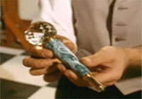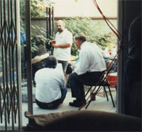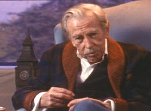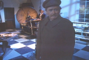 Getting the machine through the sliding glass doors was no easy task, where are Morlocks when you need them. At one point my wife had to crawl under the machine to get outside to help carry the machine. With the machine safely loaded on the truck we all met at the sound stage to unload it. After unloading the machine I was walking down one of the halls in the sound stage and as I rounded the corner I was face to face with David Filby! Alan was already in makeup and wardrobe, it was quite a surprise. The segments were shot in sequence, so the machine was not needed until later in the morning. The scenes of Alan securing the house and about to leave were shot and we then moved the Time Machine in position and reinstalled the dish and made sure everything worked. Rod had arrived at some point in the morning and was also in wardrobe. He had brought with him the smoking jacket that he had worn in the original film, and it still fit him! As we broke for lunch, Rod hung the jacket on the control lever of the machine. A great Kodak moment.