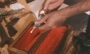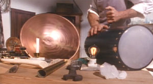 One segment of the scene required the unfinished dish to spin. How to do this had not been worked out in advance. I suggested mounting the dish on a C stand and use a pair of vise grips as a handle to spin the dish. So when you see the dish spinning it is because one of the effects men is behind it turning it by hand. |