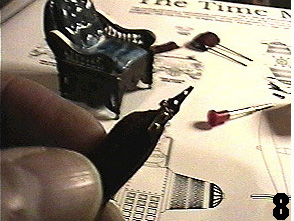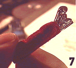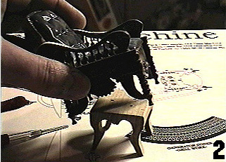 | Picture 8 is a close-up of the tiny brass hinges I used to hinge the arms as they were in the movie. Again, these can be bought at a craft store and found in the doll house section. I pre-drilled pilot holes in the arms, and inserted two small brass brads, or nails. Just a touch of super glue on the points of these nails before inserting them, then pressed into place using a sewing thimble on my finger. | ![]() |