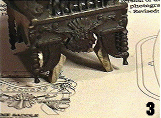 | The original chair used for the movie prop was in fact an antique barber chair. Like many barber chairs, it sat on a single-column platform that supported the chair and enabled it to raise up and down. In this manner, the four ornate legs of the chair never touched the ground. This was also the case when the barber chair was used on the Time Machine prop. The ornate legs of the chair did not actually sit on the wooden base - it was supported by a set of "inner legs" that were affixed underneathe the barber chair. When Bob Burns acquired the prop and the original chair was missing, he needed to build a new one. Not having enough detailed info on it, Bob and his friends made a good reproduction of the chair, but not exact. So this is how Lunar designed the chair for the model, using Bob's re-made chair as the example. Chris Perrotta's drawings show the support legs for the chair, so I decided to make a set to bring this model that much closer to the original prop. | |
