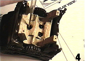 | Picture 4 displays the underside and how the inner legs were fastened to the chair using the same small doll house screws I used to secure the rest of the chair together. I also drilled 3 pilot holes up into the underside of the chair itself, to accommodate these screws, being careful not to drill all the way through the seat.In Pic 4, you are also able to see where I drilled holes up into the wooden legs from the bottom, so that the entire chair can later be screwed to the base from underneathe. This is another good reason for these legs: a means to fasten the chair to the base securely. Without these legs, the resin legs of the chair are too spindly to drill up into to accommodate the screws with a safe measure of security. | ![]() |