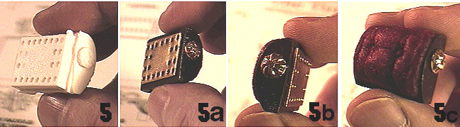 Pictures 5a and 5b also show where I ground off the molded florettes on either side of the head-rest, and replaced them with tiny brass florettes that were the perfect size that I found in a craft store. I simply cut a brass straight-pin to about a 1/4 of an inch in length, put a dab of super glue on the cut end, and inserted it through a hole in the brass florette and into a pre-drilled hole on either side of the head-rest. Picture 5c showes the front of the finished head-rest after flocking was applied. The flocking comes in a variety of colors and can be bought at most craft stores. I chose a deep burgundy-colored flocking because I thought it would add to the chair's antique look. The flocking comes in two parts: a bottle of fibers and the colored adhesive, which is like colored Elmer's Glue. You simply paint the adhesive onto the surface to be flocked, then you squeeze the fibers onto the wet adhesive. After setting, you dump the excess fibers back into the squeeze bottle. What is left is a surface coated in what looks very much like crushed velvet - perfect, I thought, for the look of this antique chair! ![]() |