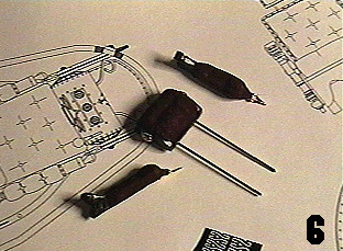 | Picture 6 shows the arms and head-rest, complete with flocking and thin brass rods inserted into the head-rest, to be trimmed when it's ready to be attached to the back of the chair. | ![]() |