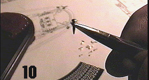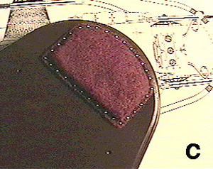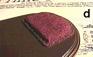 | Pic 10 shows the tiny brass tacks or nails to be inserted into the drilled holes around the cushion. These are found in any craft store that sells doll house supplies. Touch the pointed end of the tacks into some super glue and place them in the holes all around the cushion. If you need to, use a sewing thimble on your finger to push any stubborn tacks all the way into the holes. If by accident you rub or scrape off any of the flocking, it can be fixed easily enough by painting on a bit of the adhesive and more flocking applied. The base is now done! | ![]() |
