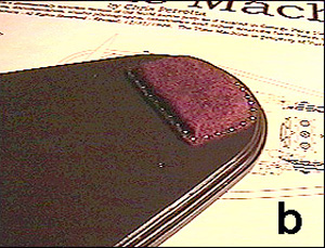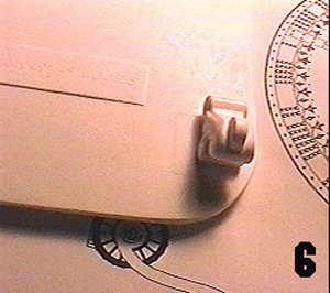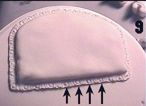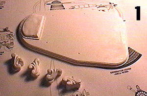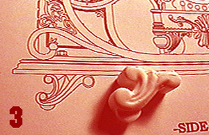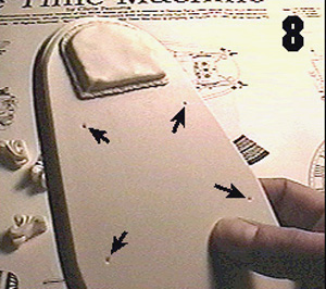 | Pic 9 indicates the molded tacks surrounding the molded foot cushion. With a fine drill bit, drill through all of these "tacks", being careful not to drill all the way through the base. These holes are for the tiny brass tacks that will be inserted after paint and flocking are applied. Before priming, wash the piece in warm water and soap to remove any release agent that might be caught in any creases or crevises, as well as any particles from drilling, sanding or filing. An old soft toothbrush is good for this. Dry with paper towels or cloth, but also let it air dry for a time - water can get trapped within the creases of the molding around the edge of the base and in any of the drilled holes that you may not be able to reach with the towel. | ![]() |