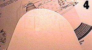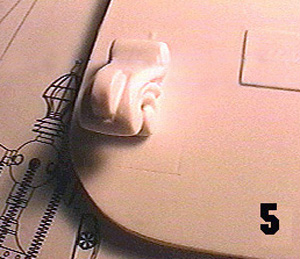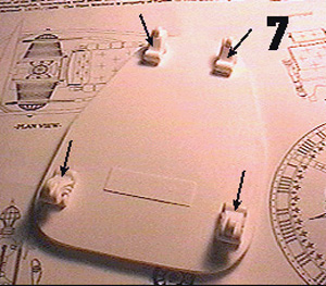 | Pic 7 shows all the placements of the legs. After they are attached with super glue, for strength and durability I've drilled pilot holes through the legs at a slight angle where indicated by arrows in pic 7.Caution should be taken to keep from drilling the pilot holes all the way through to the top surface of the base, but if this accidently happens, some body filler can be used to fill in the hole on top and sanded smooth. The pilot holes are to accept small doll house screws for a secure mounting of the legs to the base. It helps to slightly drill away around the hole's edges so the screws will be countersunk when screwed in. After the screws are in place, fill in the area around and on top of the screw with body filler, covering them. After the filler has set, the area may be sanded smooth. The screws will now be hidden. The base is almost ready for priming now. | ![]() |