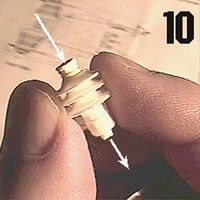 | Pic 10 shows the raw 'socket' that the bulb will be placed into. Drill all the way through this socket, as indicated with arrows. This item can now be painted red, with it's bottom-end masked off, to be painted gold by hand later. | ![]() |