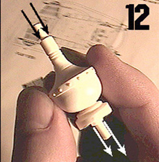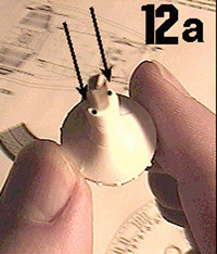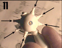 | Pic 11 shows the ball with it's electrode cones extending from it. With a very fine drill bit, drill straight into these cones as indicated by arrows. The electrode wires will be later fitted into these cones. Drill a small hole on one side of each cone - the colored coils of wire will be later fitted into these side holes. Pic 11 also shows how the ball should be drilled straight through on either side of the embedded metal rod. The wires from the red bulb will have to be threaded through this portion of the ball. | ![]() |