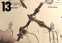 Pic 12 and 12a shows the stand and indicated with arrows where it should be drilled entirely through the structure. For this also, you will need a fine drill bit and you may have to drill from both ends to continue through the length of the structure. As mentioned before, this item also has a metal rod embedded into it, so you will have to keep as close as possible to the rod while drilling through, making sure the drilled openings are just big enough for the wires of the bulb to be fed through them. Now is a good time to thread the wires through the red painted socket until the bulb sits on top of the socket. A small drop of epoxy on the underside of the bulb will be enough to secure it in place. I have used a tiny strip of red-colored artist's tape to cover the exposed base of the bulb. Thread the wires down through the ball, fitting and securing with epoxy the end of the socket structure to the ball. Then thread the wires through the remaining stem structure, carefully fitting the ball on top and again securing with epoxy. Make sure the entire assembled structure remains as straight up & down as possible while the epoxy sets. Don't worry about any seepage of glue at this point - it can be cleaned up later. Once the epoxy has set, you can clean any glue that is exposed using an X-acto knife and can be sanded smooth if necessary. You can also fill in any open gaps with either epoxy or body filler to clean up the look of the piece. Mask off the red bulb and it's socket with masking tape and paper, so that no gold paint will get on them. You may also want to cover the wires that are dangling from the bottom so as not to get gold paint on them either if you desire. I hung the structure upside down by the wires in order to easily spray paint the item on all sides. It's at this time that you can apply a thin coat of primer. I found a beautiful gold spray paint by Krylon that's called 14 Kt. Gold. It has a nice shine and luster to it's finish. Be careful not to over-spray the item - you want to keep the details crisp. Two light coats should be good. When the structure is completely dry, you may want to use a tissue, a soft rag, or even a thin pair of gloves to handle the piece after it's been painted. Gold paint is very susceptible to fingerprints and smudges that will not polish off, so it may be a good idea to not touch the finish with your bare hands. |