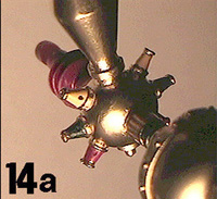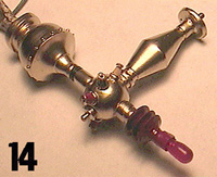 | Pics 14 and 14a show the finish in more detail. You can also see where I've drilled the side holes on the electrode cones, then painted the cones by hand in the appropiate red, yellow and green colors. You can also see a thin band of green paint around the stem, the same green as used before. If you remember, we left the bulb itself a smokey sanded finish. Simply paint on a coat or two of clear lacquer finish. The bulb is now back to it's shiny self! | |
