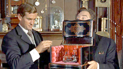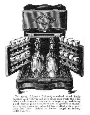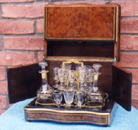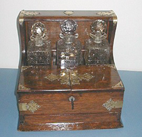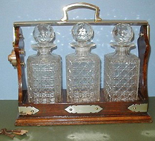 What is a Tantalus?Tantalus was a Phrygian king and the son of Zeus, who with his wife Omphale ruled over the land of Lydia. Tantalus was admitted to Mt. Olympus to reside with the gods. Tantalus rather than be content with his new surroundings, stole food, nectare, and ambrosia to give to his mortal friends on earth. Crime. He then provided a great banquet for the gods and in an effort to test their omniscience he cut up his son Pelops and added him to the stew to see if they would know he had done it. Crime. All but one of the gods realized immediately what had been done. Demeter, goddess of the Harvest, still in mourning the loss of her daughter Persephone ate most of Pelops shoulder before being stopped. As Tantalus' punishment, he was condemned to be placed in a pool of water chin deep beneath fruit trees. When he bent to drink, the water would recede; when he reached for a fruit, the wind would blow it out of his reach. Tantalus also perjured himself in regards to a golden dog stolen from Zeus which resulted in having a huge boulder hung over his head as well, constantly threatening to fall and crush him.The good news is that Pelops was reconstructed and his missing shoulder was replaced with ivory by Demeter and Pan danced for joy. Ok, so what does an ancient Greek king have to do with the Time Machine? A tantalus in more modern times, is cheifly a stand, rack or in our case a chest which holds wine or other liqours contained in decanters but unreachable as they are secured with a lock. So just as Tantalus himslf could see the water and fruits but not partake of either, so it is with a tantalus. We can see the liquor but cannot reach it.