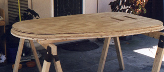 | This is the beginning of the base. It is made from four layers of plywood. The layers were from the bottom: 3/4"; 1/2"; 3/4"; and 1/2". Each layer was routed using a full size template then the edge was routed with a shaper cutter to get the correct profile. | |
