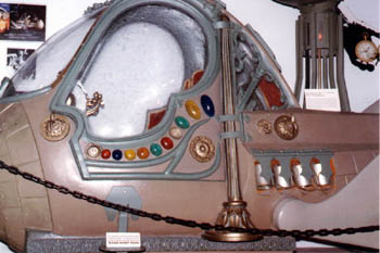 While I was working on the set of Soldier at Warner Brothers I met Kent D'Huet, who as it turned out, had been on the construction team which built the Argo. He is what I learned about it from him. The main body was craved from a block of green foam and the surface was sealed and fiberglassed over. The foam was then carved out of the fiberglass and the resulting shell was reinforced. The Solar collector was powered by a DC motor with a friction wheel. The direction was changed by an effects operator with a reverse switch. The plates on the nose of the machine were made to flap during the journey through time by having the plates attached to a sheet of dental dam and having an effects person poke at them from behind with a piece of welding rod. For the closeups of the dates changing on the console, an oversized console was built . The dates were attached to an endless mylar strip stretched between two rollers and run out several feet similar to a conveyor belt. The machine had a total of 30 zip lines coming out of it to operate all the electrical systems on the machine. The machine was literally saved from a thrash dumpster and used for Adventures in the 4th Dimension a Warner Brothers theme park in Australia |