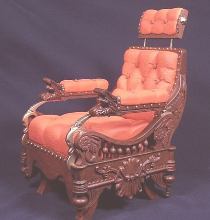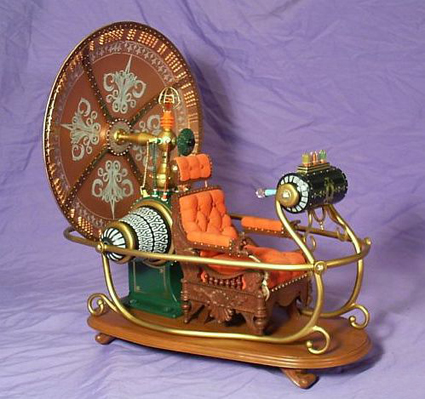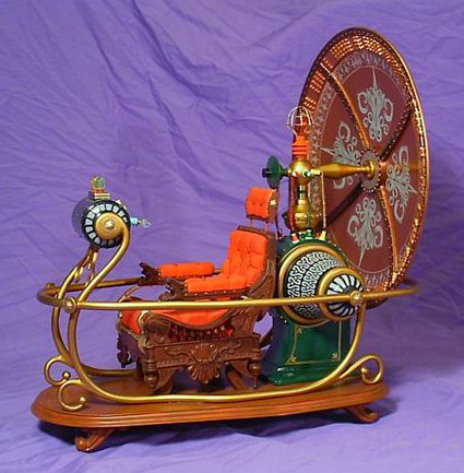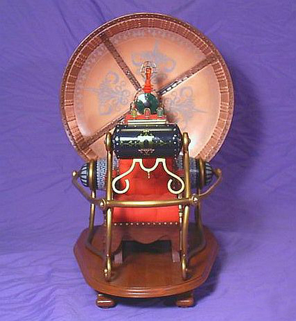 The disc is actually driven by a 90 degree gear system not underneath the disc from behind the ‘Time Generator’ housing. All the shafts are steel riding in brass tubing, all the gears where pinned so slipping will not happen. No bearings were used so it is not designed for continuous running but will last a life time if used just once in a while to show it off to friends. I have ran this model for hours without changing the four AA batteries that are accessible by removing the disc which is just a matter of unscrewing a small bump like cap and by simply removing the hidden rear door below the disc axle. Inside there is a quad AA battery holder with a long enough line to easily change the batteries The chair can be removed by undoing four screws from under the base. The simulated wood base was painted in separate strips and folks kept asking me what wood I used...I told them it is plastic and they did not believe me.