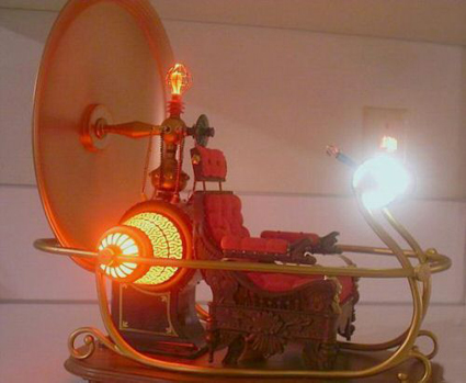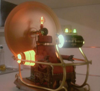 This is a custom built resin model kit that actually functions like the real movie prop. After inserting the Crystal key, you slowly move the lever upwards... first the lights turn on and then the disc starts to spin the lights on top of the ‘control console’ blink in time with the speed...one for the day another for the month and a third for the year...the day, month and year portion of the controls that face the operator turn on as well, the higher the lever the faster the disc will spin until finally at full speed the day lamp is on constant and the others are blinking madly in order! |