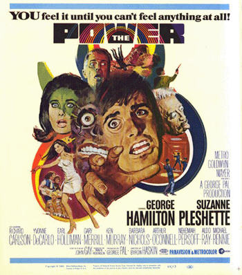 The Power (1968)After Dr. Lao, it took George three years to get his next project started. He pitched several ideas until M.G.M. finally ok'd The Power, a film Pal had been interested in since 1965. William Tuttle was on hand once again to create special makeup effects. A featurette was made with him explaining how makeup appliances were created, including the appliance worn by Arthur O'Connell after his murder in the centrifuge. An interesting aspect for me of The Power is that the institute exterior for the film was filmed at my High School during my junior year. I was somewhat surprised when arriving at school one day and finding a guard station in the middle of the street when none existed before.The globe sculpture looked very impressive and I felt it should have been left behind. I soon learned that these set pieces were for a film called The Power starring George Hamilton. Unfortunately I didn't know George Pal was producing. I was on hand one day and watched a scene in which George Hamilton and Suzanne Pleshette arrive on the grounds by car and enter the institute, which was our Robert Lee Frost auditorium.