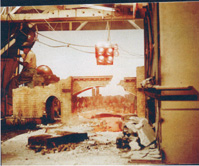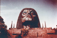 This is a photo of the hopper which held the red oatmeal. Directly in front of the opening is a screen to stop any large lumps of oatmeal from getting to the model. The shot was preped on a Friday, the oatmeal was cooked and dyed and placed into the hopper. The model was covered in polyethelyene sheeting so they could do a test of the effect and not ruin the model. The setup was left until Monday. On Monday Wah and Gene were set up with the cameras between the model and the back wall of the studio. The test comenced by opening up the hopper and allowing the oatmeal to run down into the model. Only problem was the oatmeal had fermented over the weekend and stank to high heaven and was no longer thick but instead thin and watery. This smelly watery sludge was now rapidly advancing on Gene and Wah and they had nowhere to hide. Accoring to Wah they were spared being covered by their 'lava'. The studio was cleaned up, the smell apparently lasted some days however. New oatmeal was prepared and used the same day. The shot worked perfectly this time and these are the scenes which we see in the film. |